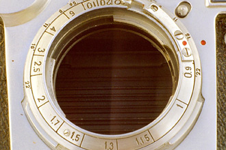 | Verschluss | Vertikal ablaufender Metallschlitzverschluss, Zeiten 1-1/2-1/5-1/10-1/25-1/50-1/125-1/250-1/500-1/1250 und B. |